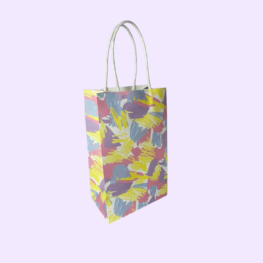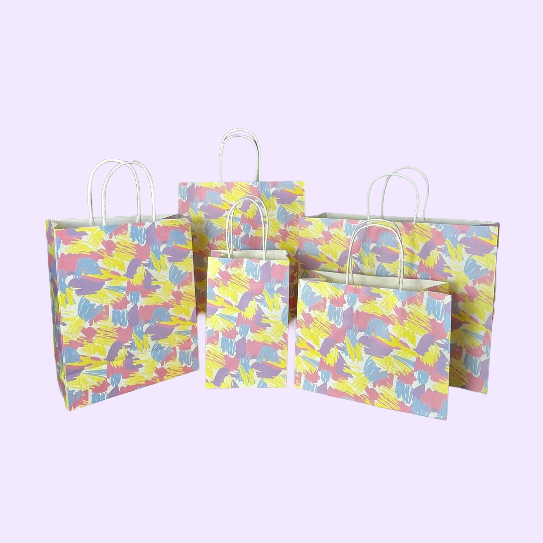 Bolsa de papel kraft blanco, resistente y práctica con un diseño impreso y asas blancas. Ideal para regalar, detalles especiales, eventos y empaques de productos.